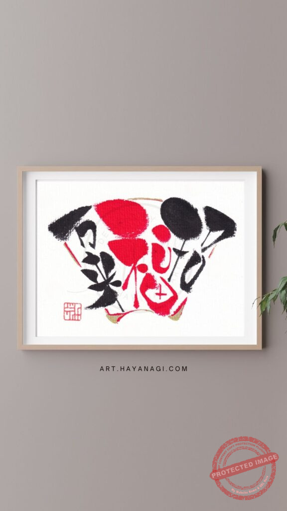 その特別な形の中に、力強い筆文字で『招福万来』を収めることで、「やってきた福を逃さず、家庭の中に大きく広げていく」というイメージを形にしています。